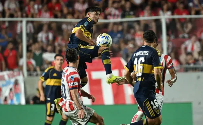 Boca no tuvo llegadas hasta los 19 minutos del primer tiempo, cuando una buena combinación entre los mediocampistas Leandro Paredes y Santiago Ascacibar habilitó al delantero Miguel Merentiel, cuyo remate bajo entraba suave por el segundo palo, aunque el carrilero Mateo Del Blanco corrió a toda velocidad y llegó a tiempo para despejar la pelota a centímetros de la línea de gol.
