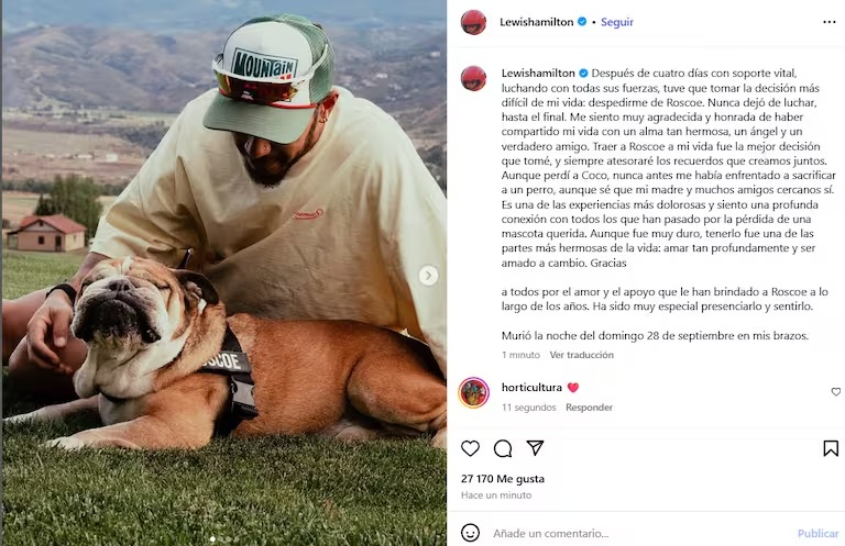 Lewis Hamilton, piloto de la Fórmula 1, sufrió la pérdida de su perro Roscoe. En un posteo de su cuenta de Instagram, el oriundo de Reino Unido anunció su muerte y conmocionó a sus seguidores al revelar cómo fueron sus últimos momentos.