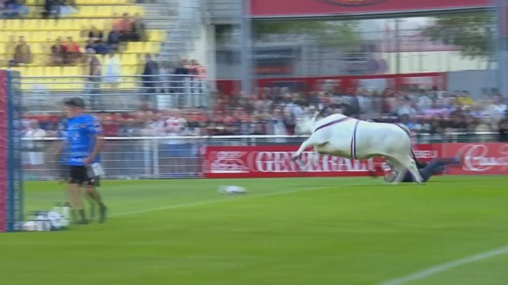 Un enorme toro irrumpió en el terreno de juego antes de un partido de la Superliga inglesa de rugby, disputado el pasado viernes entre los Catalans Dragons y el Saint Helens, que aunque son equipos de Francia juegan en el campeonato británico.
