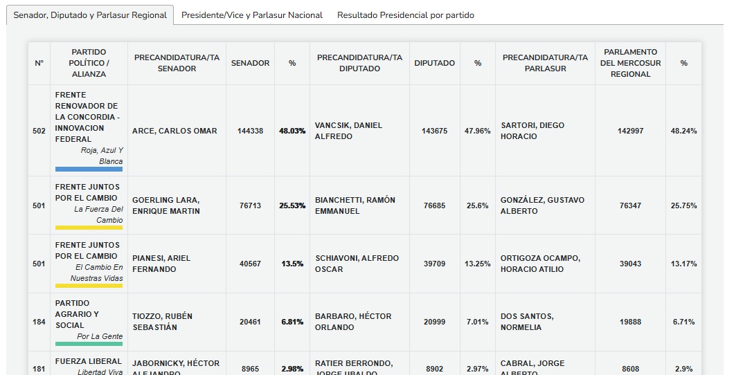 El análisis del recuento de votos provisorio marcó una gran diferencia la fórmula renovadora sobre sus competidores. En el caso de los candidatos a senadores, Carlos Arce y Sonia Rojas Decut sumaron 144.338 votos a favor (48.3%), números que los posicionan como los principales candidatos a llevar el mandato misionero a la Cámara Alta. Mientras que en el caso de los candidatos a diputados nacionales, Daniel Colo Vancsik y Yamila Ruiz, también obtuvieron 143.675 votos con un porcentaje del 47,9%.