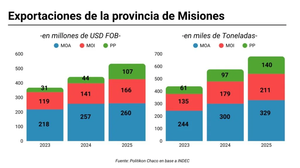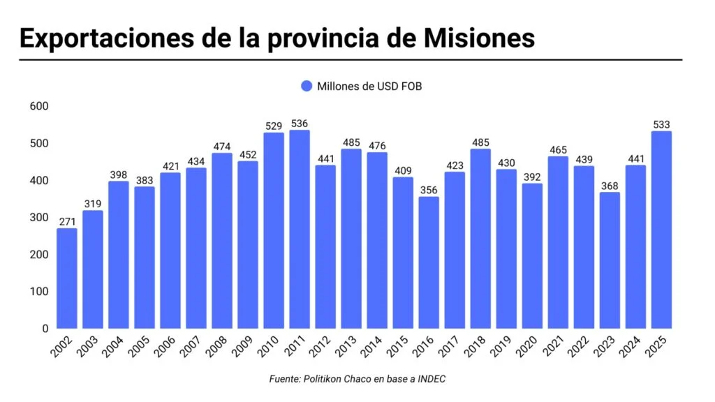 La provincia concentró el 47% de las ventas al exterior en todo el NEA durante el 2025, con un valor que superó los 533 millones de dólares. El fuerte perfil manufacturero de Misiones, donde el 80% de sus exportaciones son productos industrializados, consolidó su liderazgo regional.