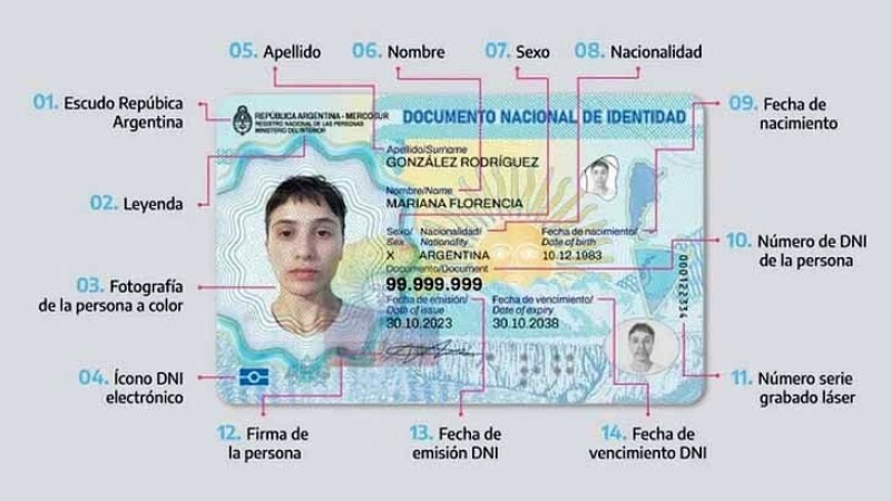 En cuanto al diseño, suma relieves táctiles e imágenes con simbología nacional, en línea con las normas de la Organización de Aviación Civil Internacional (OACI). Incluye también firma digital, lo que permite realizar gestiones virtuales con mayor nivel de validación. En el frente figuran el escudo nacional, la leyenda “República Argentina – Mercosur”, la fotografía color y los datos personales. Los excombatientes de Malvinas mantienen la identificación como “Héroe” o “Heroína”. En el dorso aparecen domicilio, lugar de nacimiento, CUIL, código QR y zona de lectura mecánica.