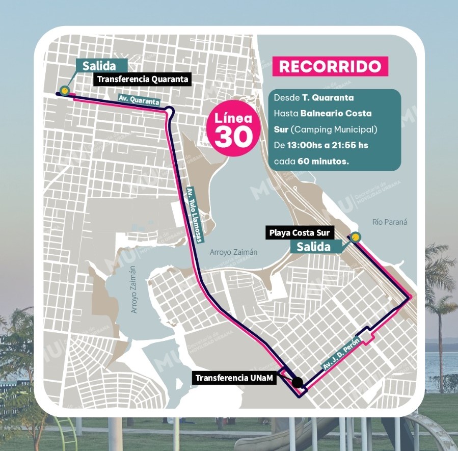 Recorrido y horarios: El trayecto iniciará en la Terminal de Transferencia Quaranta, conectando puntos estratégicos como la Transferencia UNaM, hasta finalizar en el Balneario Costa Sur (Camping Municipal).