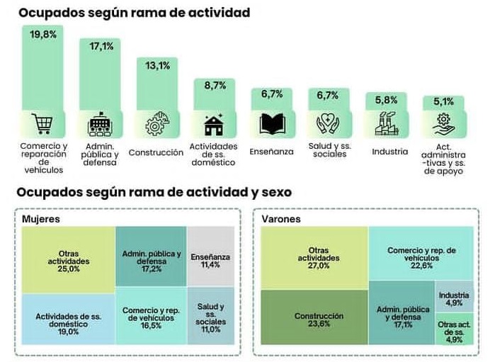 El sector de servicio doméstico ha sido la principal fuente de empleo para mujeres, mientras que los hombres presentan una mayor presencia en áreas como la construcción y el comercio de vehículos.