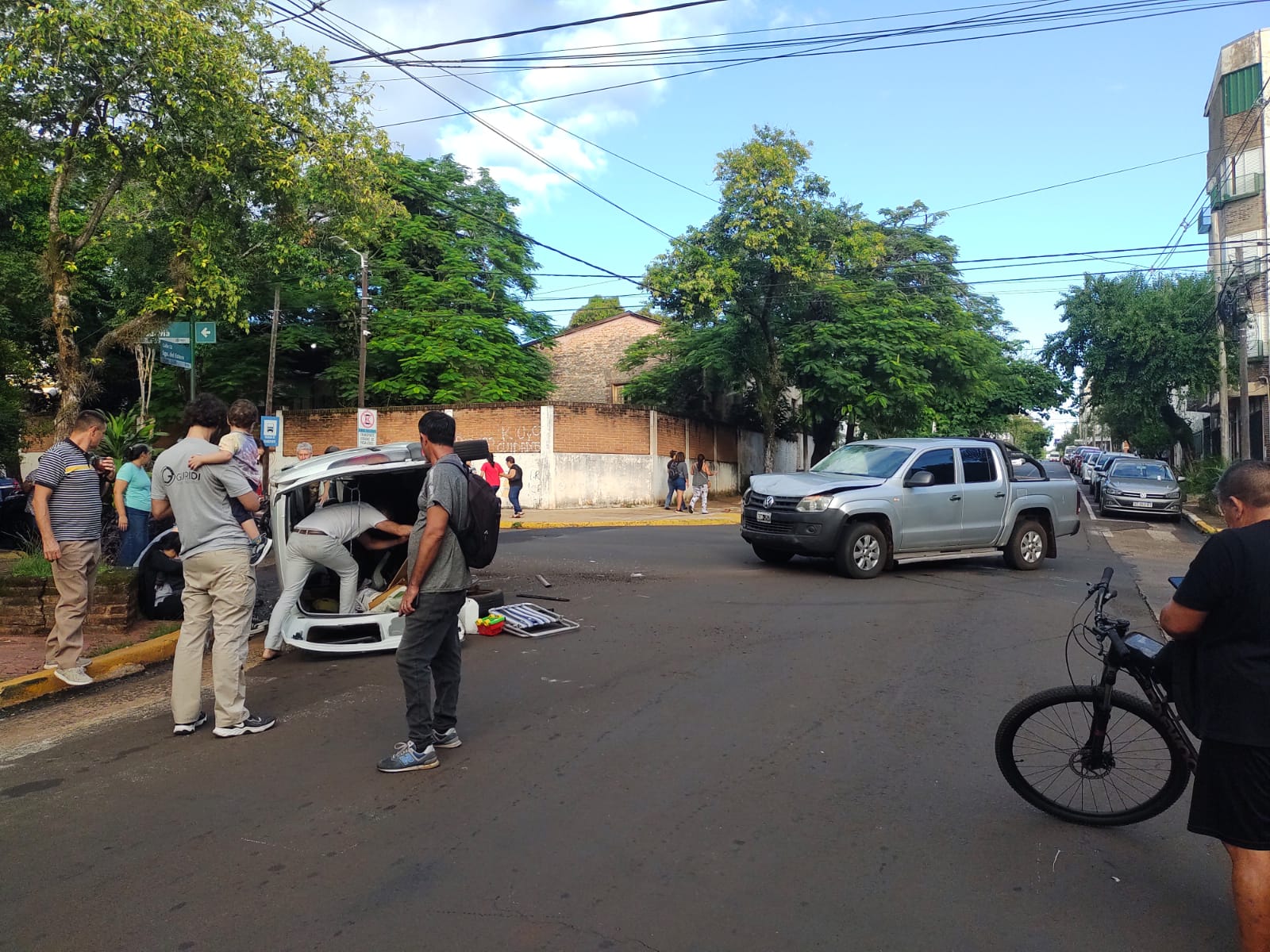 A raíz del impacto, la Kangoo terminó volcando sobre la calzada, lo que motivó la rápida intervención de efectivos policiales y personal de Bomberos que trabajaron en el lugar.