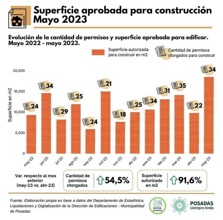 Durante mayo de 2023, se otorgaron un total de 34 certificados de permisos de obra, autorizando una superficie de aproximadamente 18,109.6 metros cuadrados para construcciones residenciales y no residenciales. De este total, el 51,2% correspondió a obras nuevas y ampliaciones de obras existentes, lo que indica que más de la mitad de los permisos de obra fueron destinados a proyectos completamente nuevos o a la expansión de construcciones ya existentes.