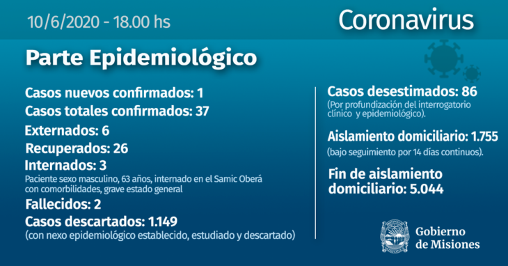 El parte epidemiológico provisto diariamente por el Gobierno de Misiones da cuenta de un nuevo caso confirmado en la provincia. Se trata de una mujer de 47 años, residente de Aristóbulo del Valle.