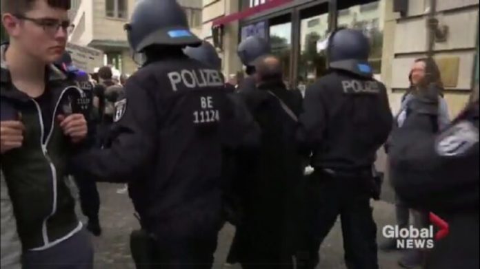 El ayuntamiento de la capital alemana prohibió inicialmente la manifestación de este sábado por «razones de salud pública»: la imposibilidad de respetar la distancia de al menos 1,5 metros entre los manifestantes.