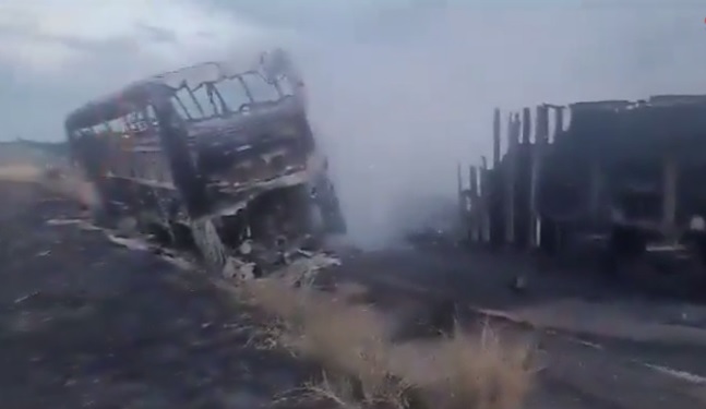 El accidente ocurrió en la madrugada. Ambos vehículos chocaron frontalmente y se incendiaron. Hay 18 sobrevivientes, algunos heridos de gravedad.