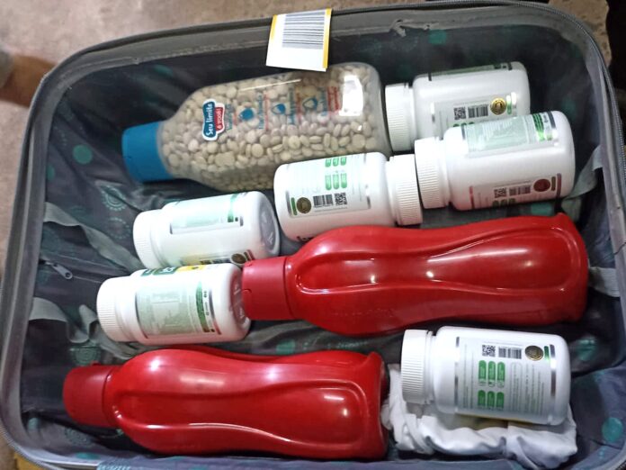 Tras identificar a la propietaria -una ciudadana brasileña que viajaba acompañada de su pareja de igual nacionalidad- se la convocó junto a testigos para la requisa del equipaje. Entre prendas de vestir, el personal policial encontró seis frascos de levadura de cerveza y tres botellas plásticas que contenían comprimidos marrones. Al someter la sustancia a reactivo químico, dio positivo para anfetaminas.