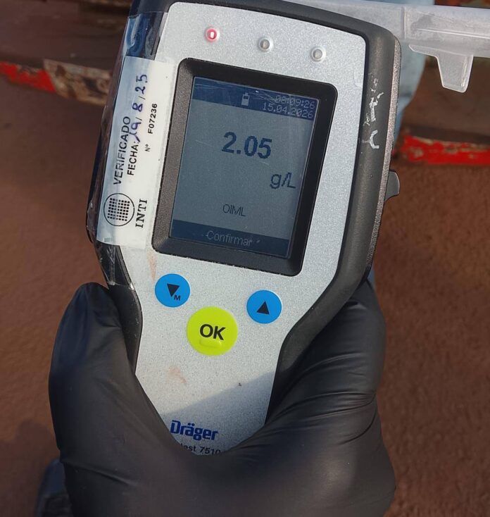 Durante el control, los uniformados identificaron al conductor y, tras solicitarle la documentación correspondiente, le practicaron el test de alcoholemia, el cual arrojó resultado elevado de alcohol en sangre. Ante la infracción, se procedió a la demora preventiva del motociclista por circular en estado de intoxicación alcohólica, así como también a la retención del rodado en el que se desplazaba.