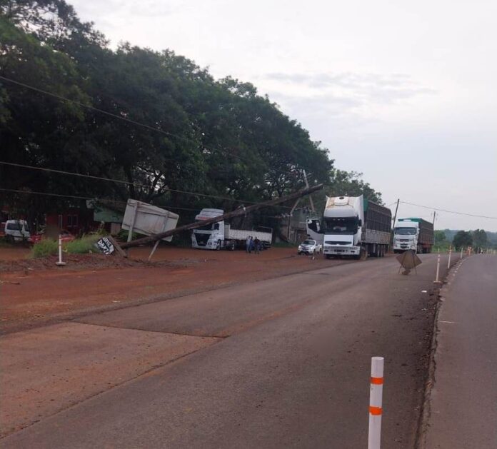 El hecho se registró cerca de las 18:40 horas de este miércoles, sobre la Ruta Nacional 105, a la altura del kilómetro 34, en la localidad de San José, donde por causas que se investigan dos postes del tendido eléctrico cayeron sobre la calzada, alcanzando a dos camiones que transitaban por la zona.