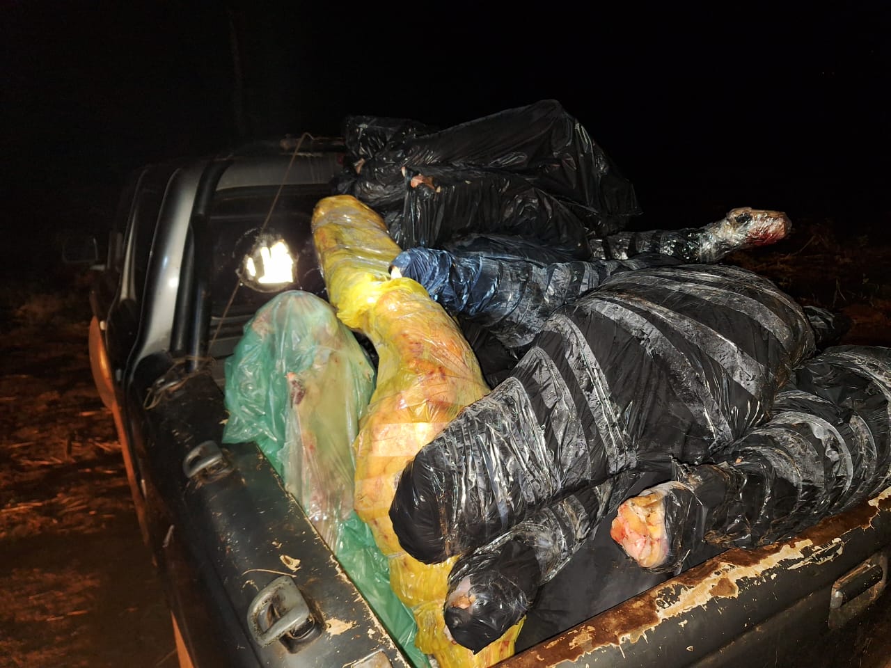 En horas de la noche, los uniformados detuvieron la marcha de una camioneta sin patentes colocadas que, a simple vista, cargaba con una enorme cantidad de bultos envueltos en bolsas de consorcio, los cuales aparentaban contener productos cárnicos.