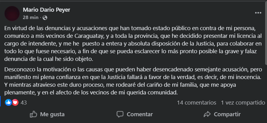 En su publicación, Peyer dijo que se puso “a entera y absoluta disposición de la Justicia, para colaborar en todo lo que fuese necesario, a fin de que se pueda esclarecer lo más pronto posible la grave y falaz denuncia de la cual he sido objeto”.