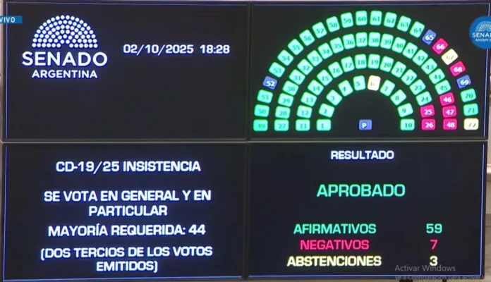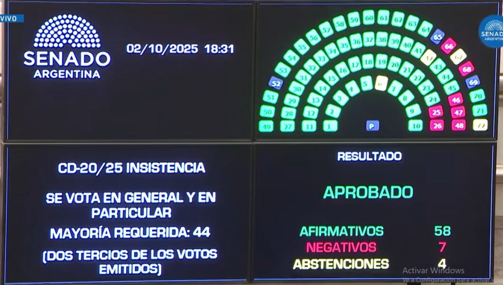 Minutos después el Senado aprobó la insistencia definitiva de la Ley de Financiamiento Universitario con 58 votos afirmativos, 7 negativos y 4 abstenciones. El Gobierno nacional queda obligado a promulgar la ley ya que el texto superó ampliamente los dos tercios que establece la Constitución Nacional.