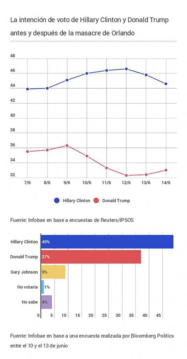 De todos modos, Bloomberg Politics realizó una encuesta entre el 10 y el 13 de junio y el resultado final fue de 49% para Clinton y 37 para Trump. Es decir que, más allá de que Reuters/IPSOS detectó un leve recorte de la diferencia después del domingo, ambas consultoras coinciden en que hoy la postulante demócrata aventaja a su rival por cerca de 12 puntos.