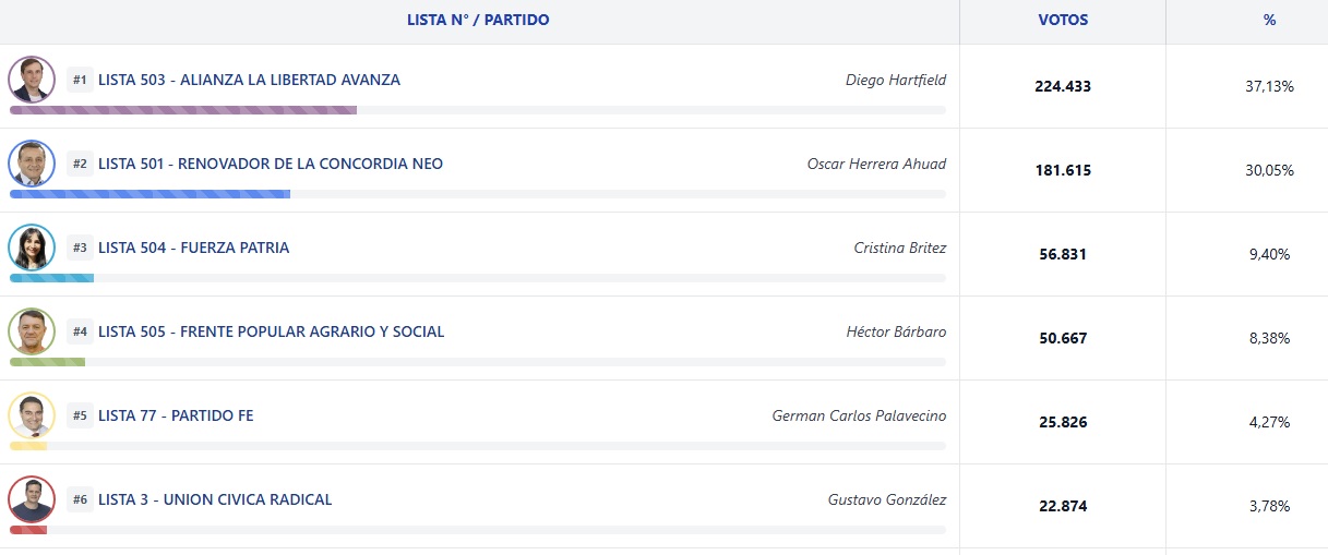 La Lista 503 – Alianza La Libertad Avanza, encabezada por Diego Hartfield, obtiene 224.433 votos, equivalentes al 37,13% del total. En segundo lugar se ubica la Lista 501 – Renovador de la Concordia NEO, liderada por Oscar Herrera Ahuad, con 181.615 votos, que representan el 30,05%.