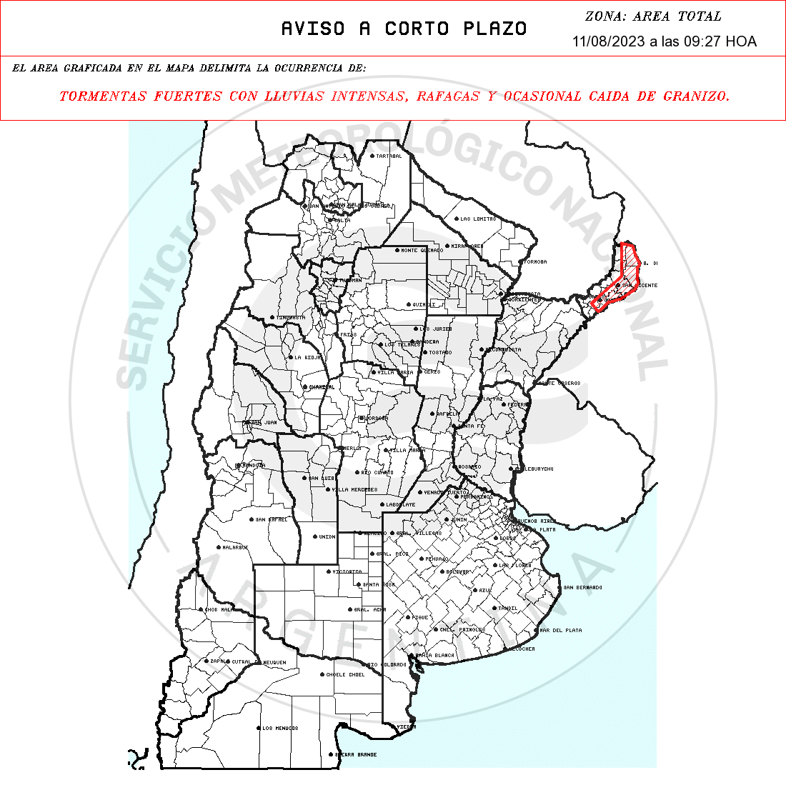 Este aviso fue emitido a las 09:27 de hoy y tiene una validez de tres horas desde la emisión.