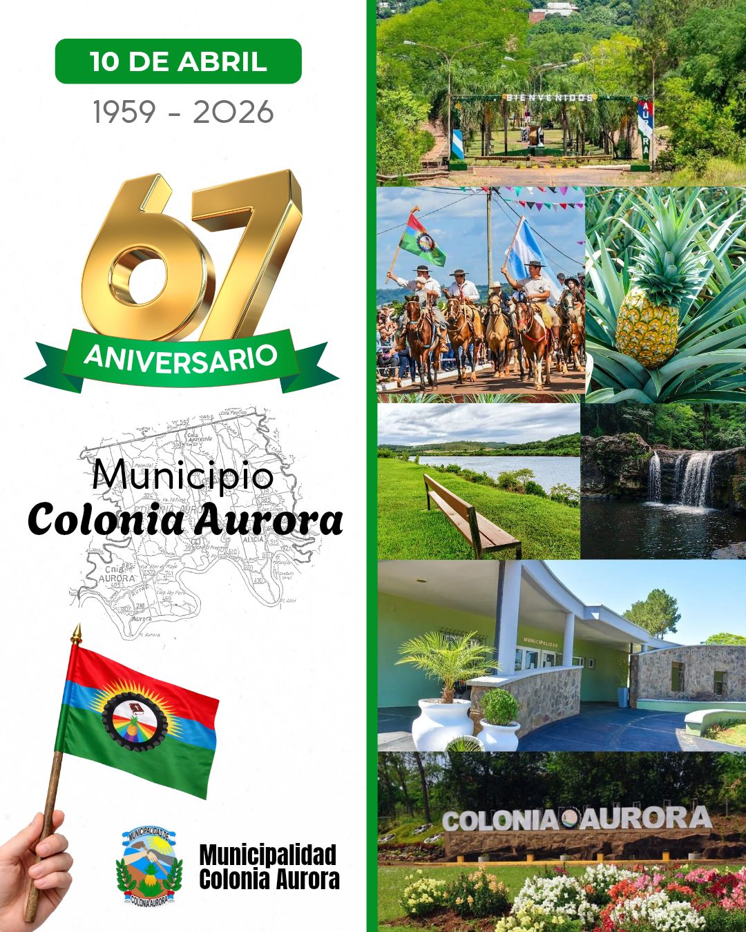 Este viernes, Colonia Aurora cumple 67 años y el acto aniversario será este sábado 11 de abril, desde las 9:00, en la plaza Manuel Belgrano. El municipio está ubicado a la vera del río Uruguay y fue refundada a fines de la década de 1950. La población está compuesta, en su mayoría, por productores agropecuarios. Se destaca por la diversidad productiva como tabaco, yerba mate, soja, maíz, ganadería y lácteos. Es la Capital Provincial del Ananá y busca fortalecer su economía en el turismo rural.